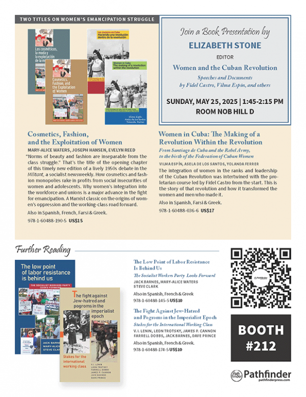 With 450 titles in English, Spanish, French, Arabic, and Farsi, Pathfinder Press offers books that are a vital part of the deepening discussion on which way forward out of capitalism’s economic, moral, and social crisis and unending wars that threaten humanity. Books on Cuba’s socialist revolution, labor struggles, Black and women’s liberation, Jew-hatred, and writings by revolutionary leaders, including Karl Marx, Frederick Engels, V. I. Lenin, Fidel Castro, Che Guevara, Thomas Sankara, Malcolm X, Farrell Dobbs, Nelson Mandela, Maurice Bishop, Mary-Alice Waters, Jack Barnes, and many others.