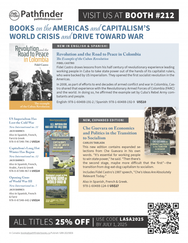 With 450 titles in English, Spanish, French, Arabic, and Farsi, Pathfinder Press offers books that are a vital part of the deepening discussion on which way forward out of capitalism’s economic, moral, and social crisis and unending wars that threaten humanity. Books on Cuba’s socialist revolution, labor struggles, Black and women’s liberation, Jew-hatred, and writings by revolutionary leaders, including Karl Marx, Frederick Engels, V. I. Lenin, Fidel Castro, Che Guevara, Thomas Sankara, Malcolm X, Farrell Dobbs, Nelson Mandela, Maurice Bishop, Mary-Alice Waters, Jack Barnes, and many others.